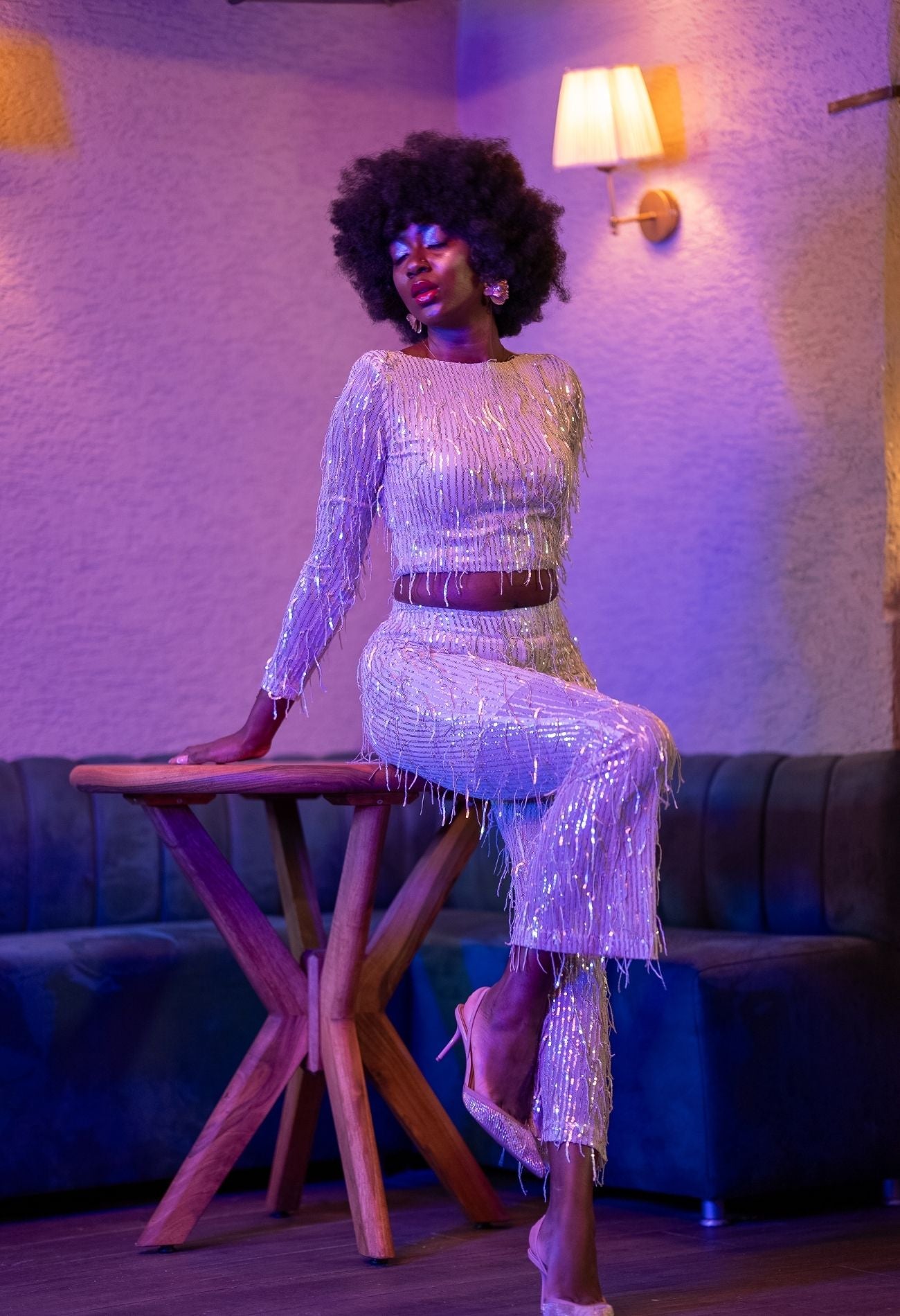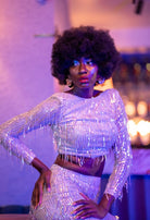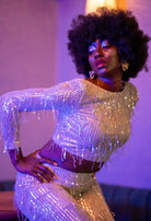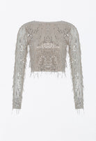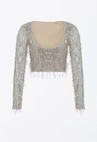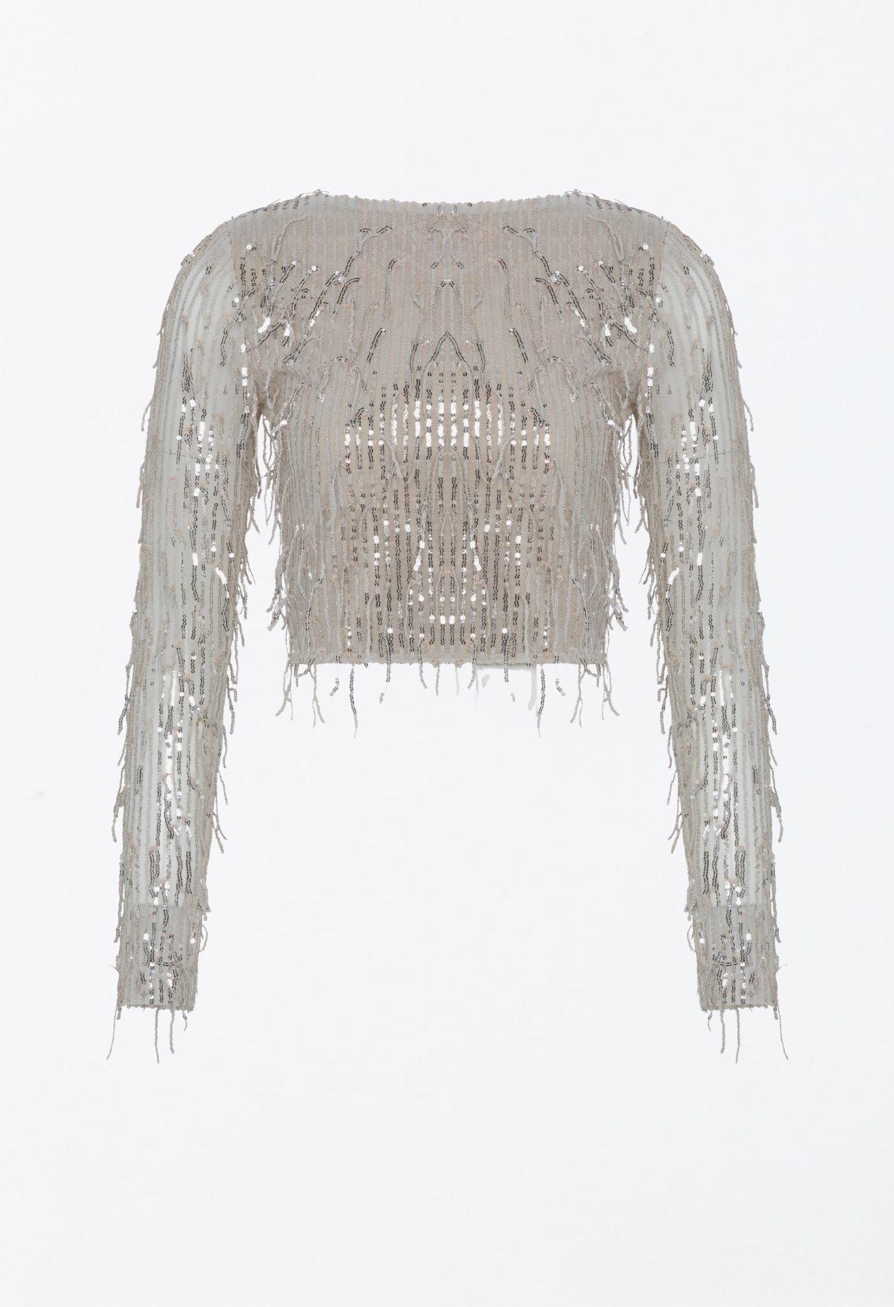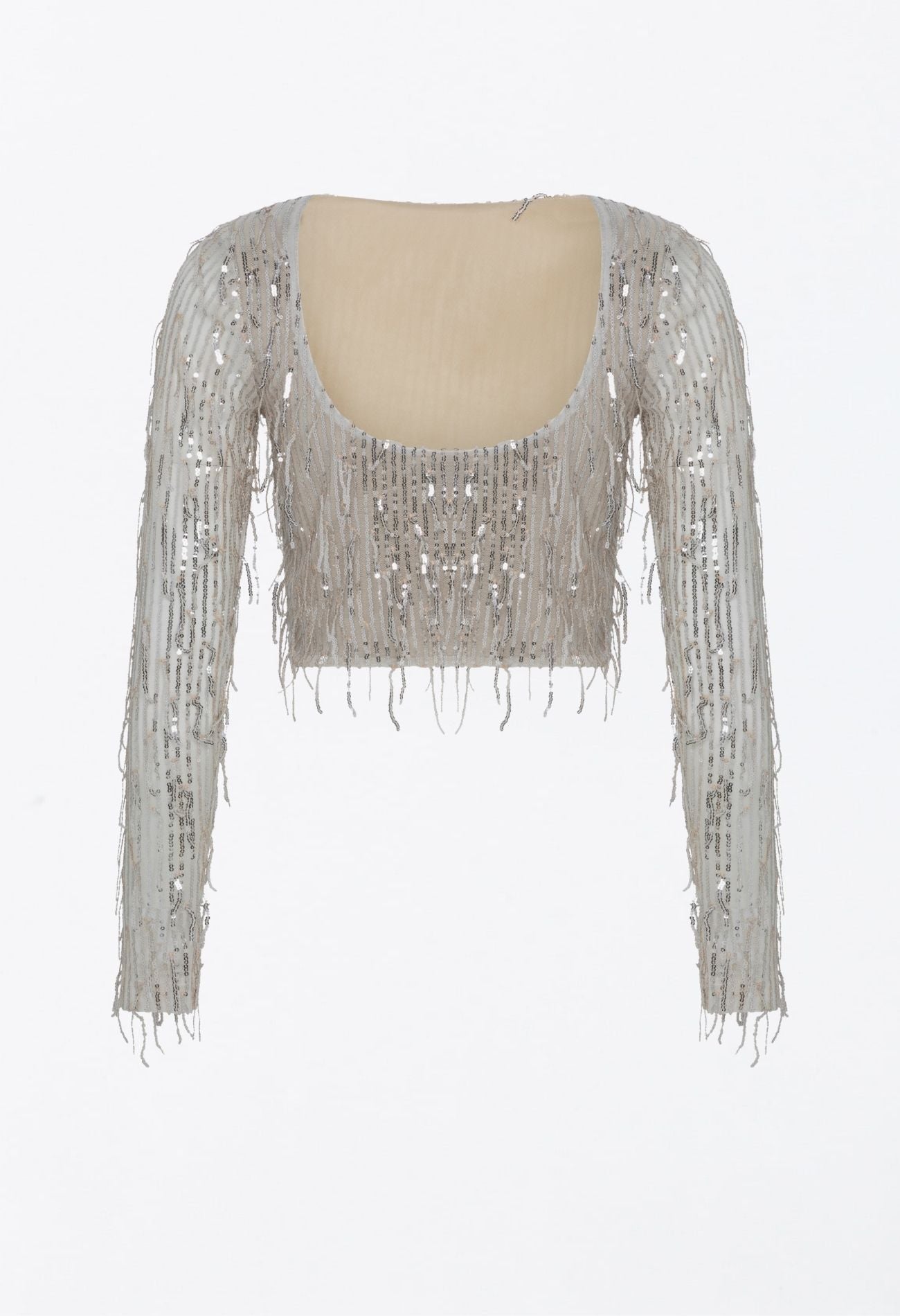 بلوزة قصيرة مزينة بشراشيب مرصعة بالترتر من سيلفي - فضية