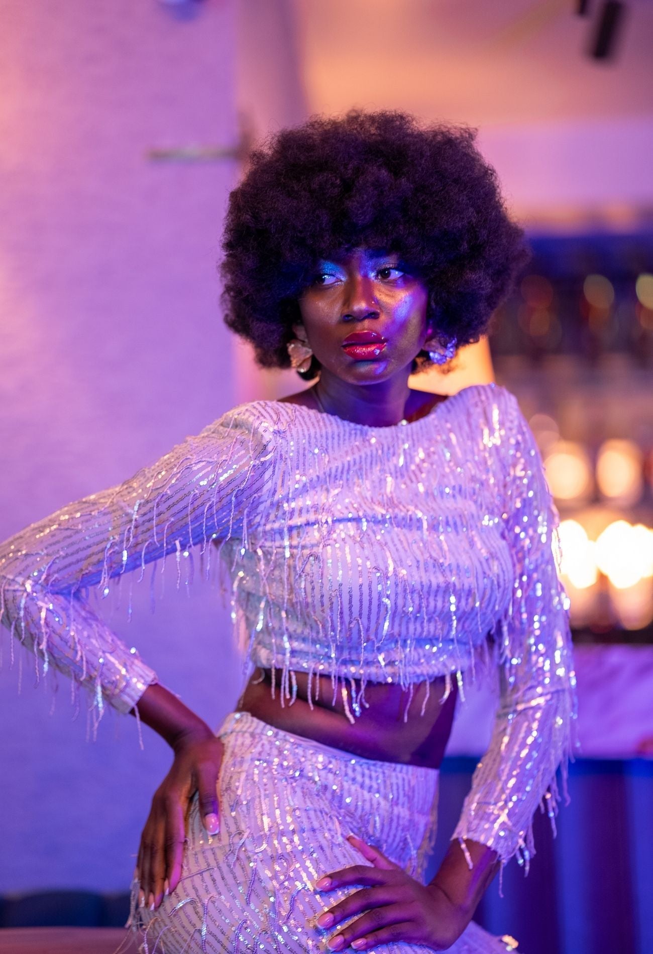 بلوزة قصيرة بأكمام طويلة مزينة بالترتر والشرابات