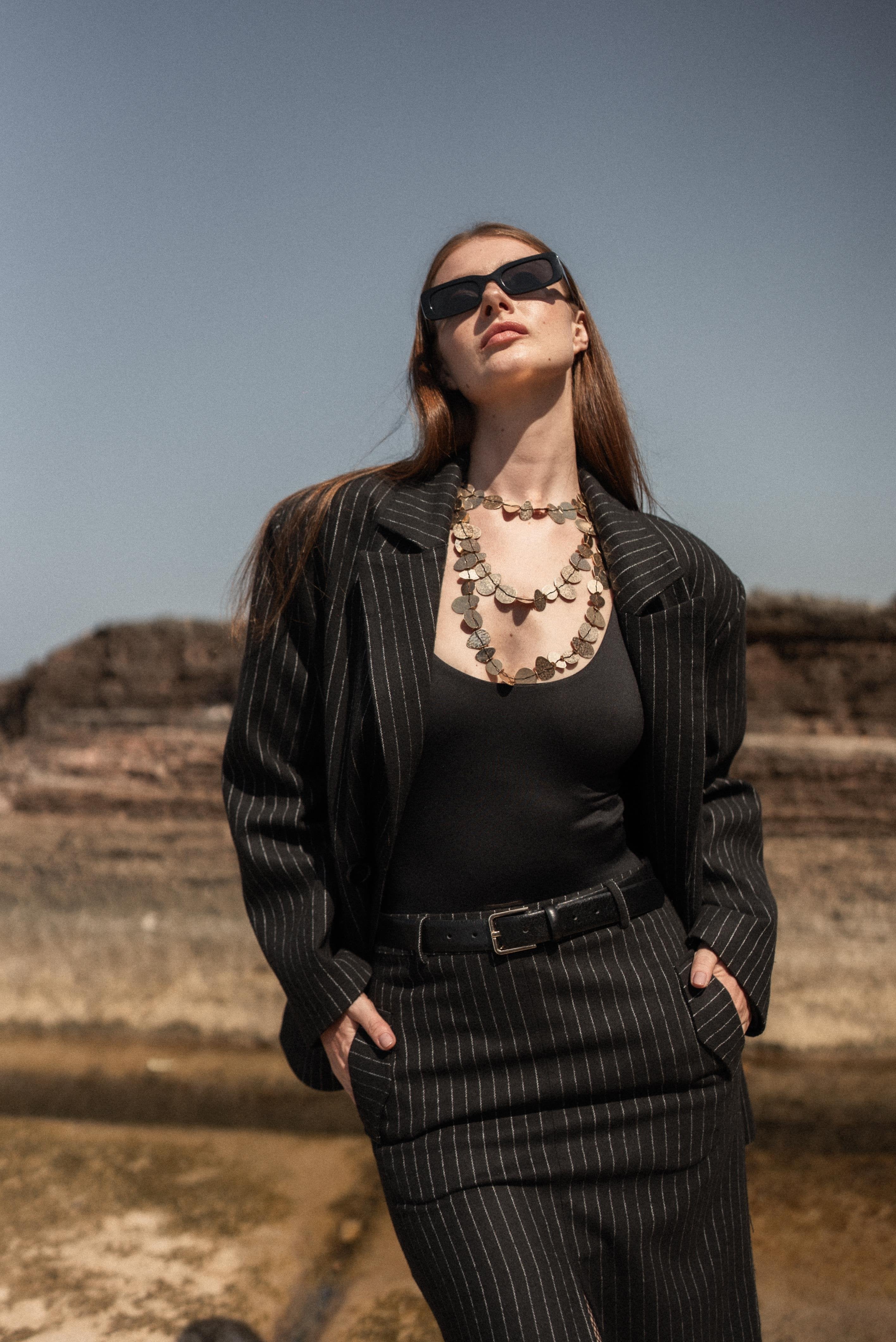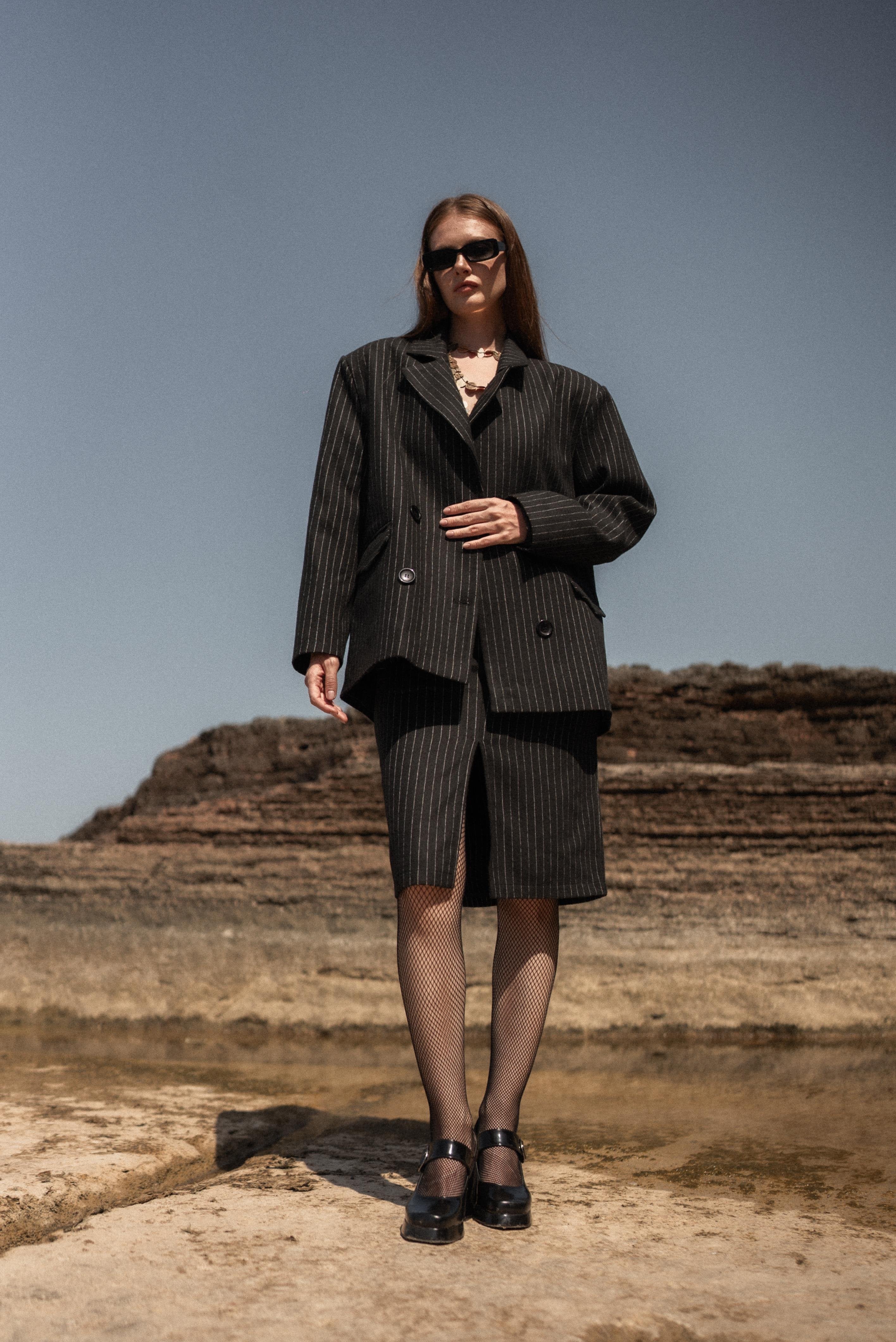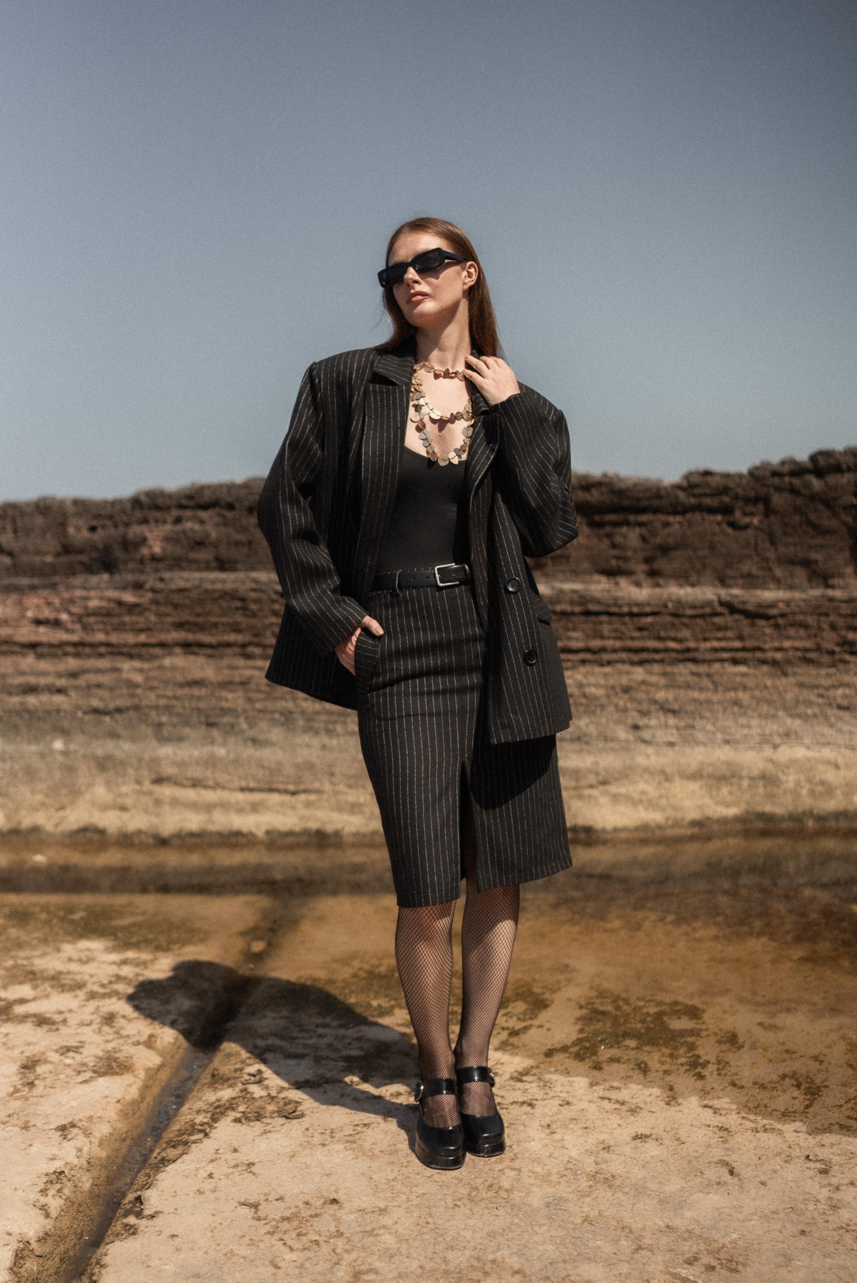 Dikey ince çizgili deseni ile daha uzun ve zarif bir siluet etkisi yaratır.
